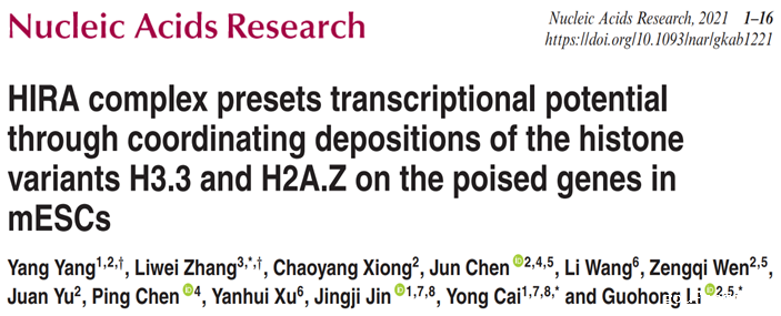 ✅雷竞技raybet在线-英雄联盟蔡勇教授团队与中国科学院生物物理研究所李国红研究员团队合作,利用基因编辑技术结合CUT&Tag-ChIP-Seq等基因组学分析方法,阐释了小鼠胚胎干细胞(mESC)中组蛋白变体H3.3和H2A.Z之间通过协同调节增强子和启动子调控区域的染色质动力学来启始基因转录的作用机制。相关研究结果以“HIRA complex presets transcriptional potential through coordinating depositions of the histone variants H3.3 and H2A.Z on the poised genes in mESCs”为题,2021年12月11日在线发表于Nucleic Acids Research。