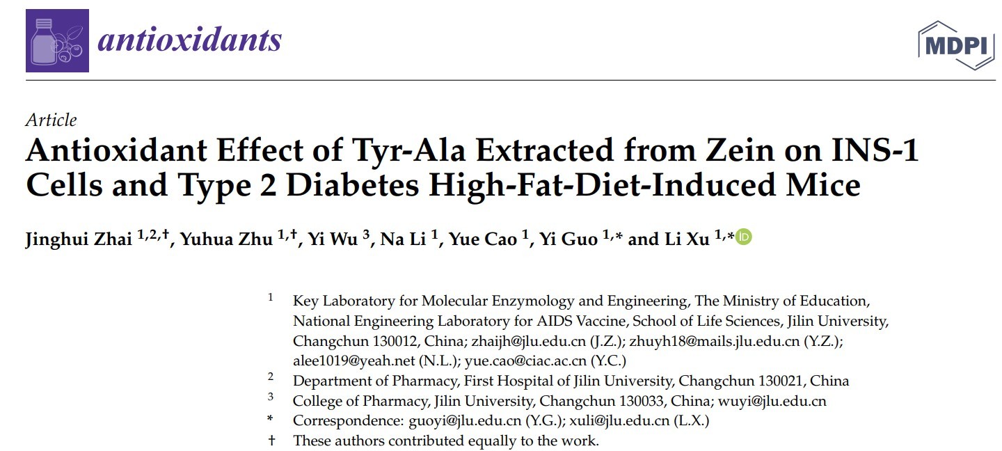 2022年6月2日,✅雷竞技raybet在线-英雄联盟徐力教授团队在《Antioxidants》发表小分子生物活性肽调节胰岛素分泌研究成果(Antioxidant Effect of Tyr-Ala Extracted from Zein on INS-1 Cells and Type 2 Diabetes High-Fat-Diet-Induced Mice, Antioxidants 2022, 11(6), 1111)。