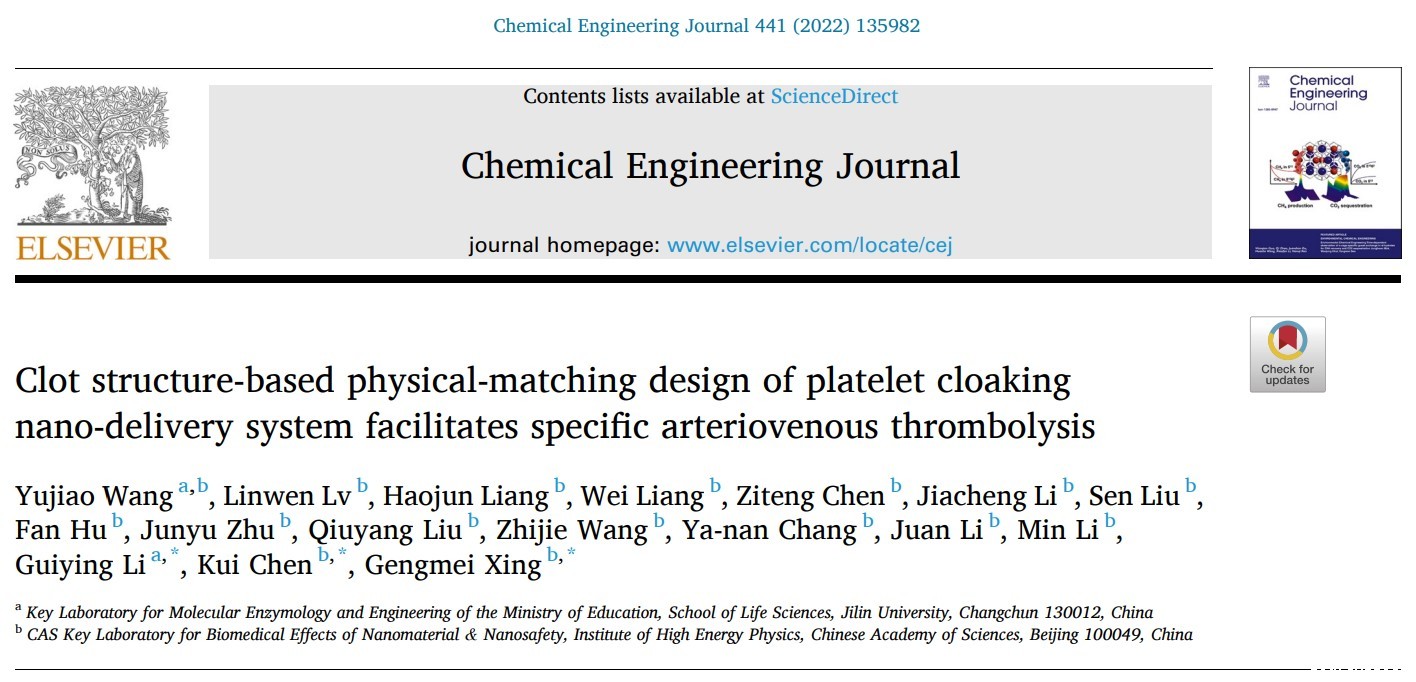 ✅雷竞技raybet在线-英雄联盟分子酶学工程教育部重点实验室李桂英教授团队与中国科学院高能物理研究所邢更妹研究员团队合作,通过调整血小板膜伪装递送系统的粒径,优化递送系统在动静脉血栓中的渗透性和滞留性,构建出物理匹配型血栓递送系统,实现了动脉静脉血栓的特异性溶栓治疗。相关研究成果以“Clot structure-based physical-matching design of platelet cloaking nano-delivery system facilitates specific arteriovenous thrombolysis”为题,于2022年8月1日正式发表在Chemical Engineering Journal。