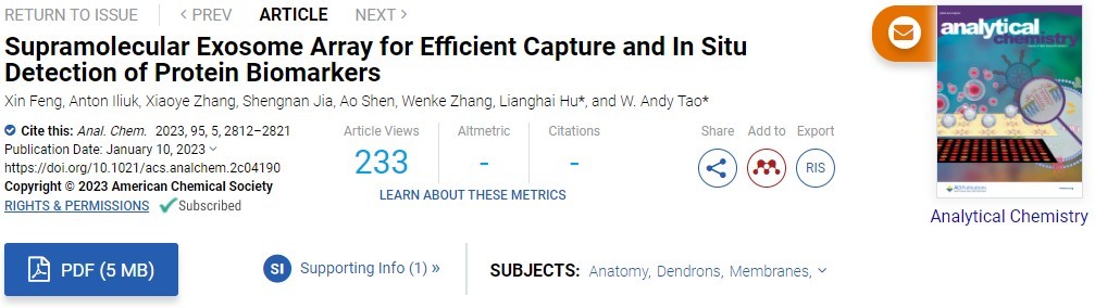 ✅雷竞技raybet在线-英雄联盟胡良海教授与普渡大学癌症研究中心陶纬国教授合作,开发了一种高通量阵列探针用于外泌体高效捕获和蛋白标志物的原位检测。2023年2月7日以题为“Supramolecular Exosome Array for Efficient Capture and In Situ Detection of Protein Biomarkers”的封面文章发表于ACS出版社的Analytical Chemistry。