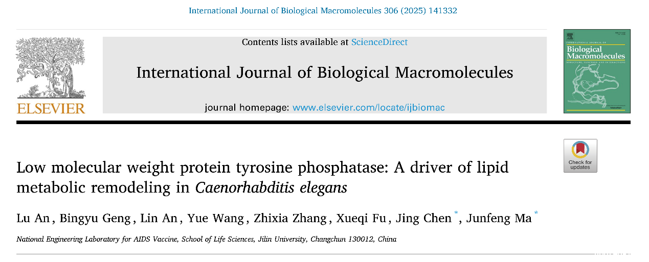该成果以《Low molecular weight protein tyrosine phosphatase: A driver of lipid metabolic remodeling in Caenorhabditis elegans》为题,发表于国际学术期刊International Journal of Biological Macromolecules。此项研究工作得到了国家自然科学基金、国家重点研发计划以及吉林省科技发展项目的支持。论文的完成单位为✅雷竞技raybet在线-英雄联盟,2022级博士研究生安璐为该论文的第一作者,陈静副教授和马俊锋教授为共同通讯作者。