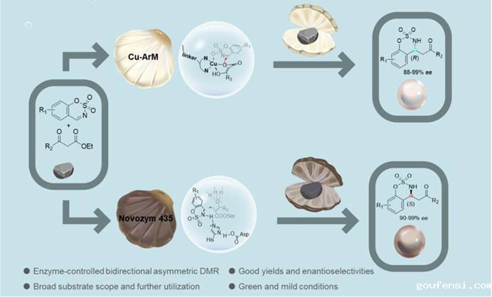 该研究报道了一种酶控双向对映选择性催化策略,用于不对称脱羧曼尼希反应(DMR)合成手性β-磺酰胺酮。研究通过构建铜人工金属酶(Cu-ArM)和利用商业脂肪酶Novozym 435,分别实现对R和S构型产物的高选择性合成。Cu-ArM由生物素化铜复合物与链霉亲和素(WT-Sav)组装而成,催化环状磺酰胺与β-酮酯反应生成R构型产物;而Novozym 435通过其催化三元活性中心调控反应路径,高效获得S构型产物。分子动力学模拟揭示了酶-底物相互作用机制,阐明环状亚胺因稳定氢键网络和紧凑构象而优于非环状底物的原因。该方法在温和水相条件下实现低催化剂负载(Cu-ArM仅0.5 mol%),并成功应用于克级合成及药物分子衍生物制备(如降压抗炎活性分子chroman-4-amine)。该工作为绿色合成手性含氮药物分子提供了新范例,拓展了生物催化在不对称合成中的应用潜力。论文第一完成单位为✅雷竞技raybet在线-英雄联盟,✅雷竞技raybet在线-英雄联盟博士研究生唐勇和许雅宁博士为该论文的共同第一作者,吉林大学王磊教授,李奉熙博士为该论文的共同通讯作者。