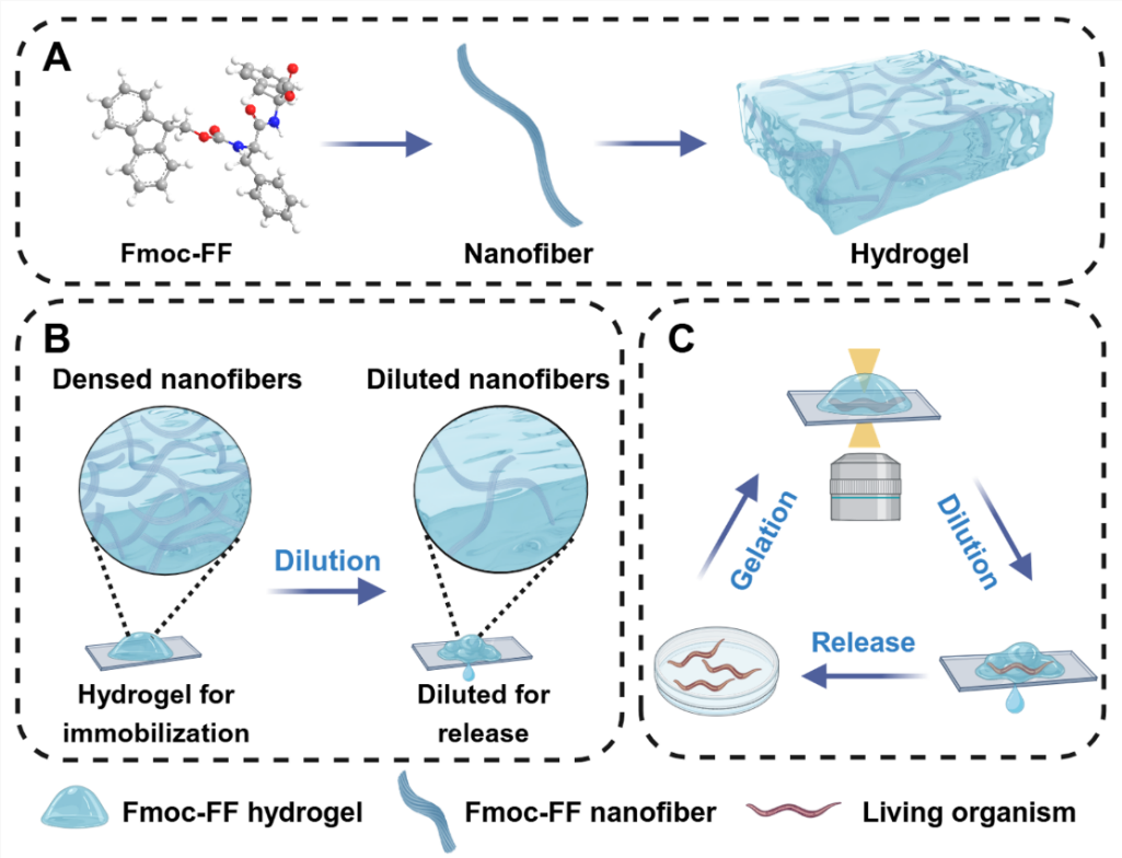图1. 自组装二肽水凝胶用于秀丽隐杆线虫循环固定、成像与释放。