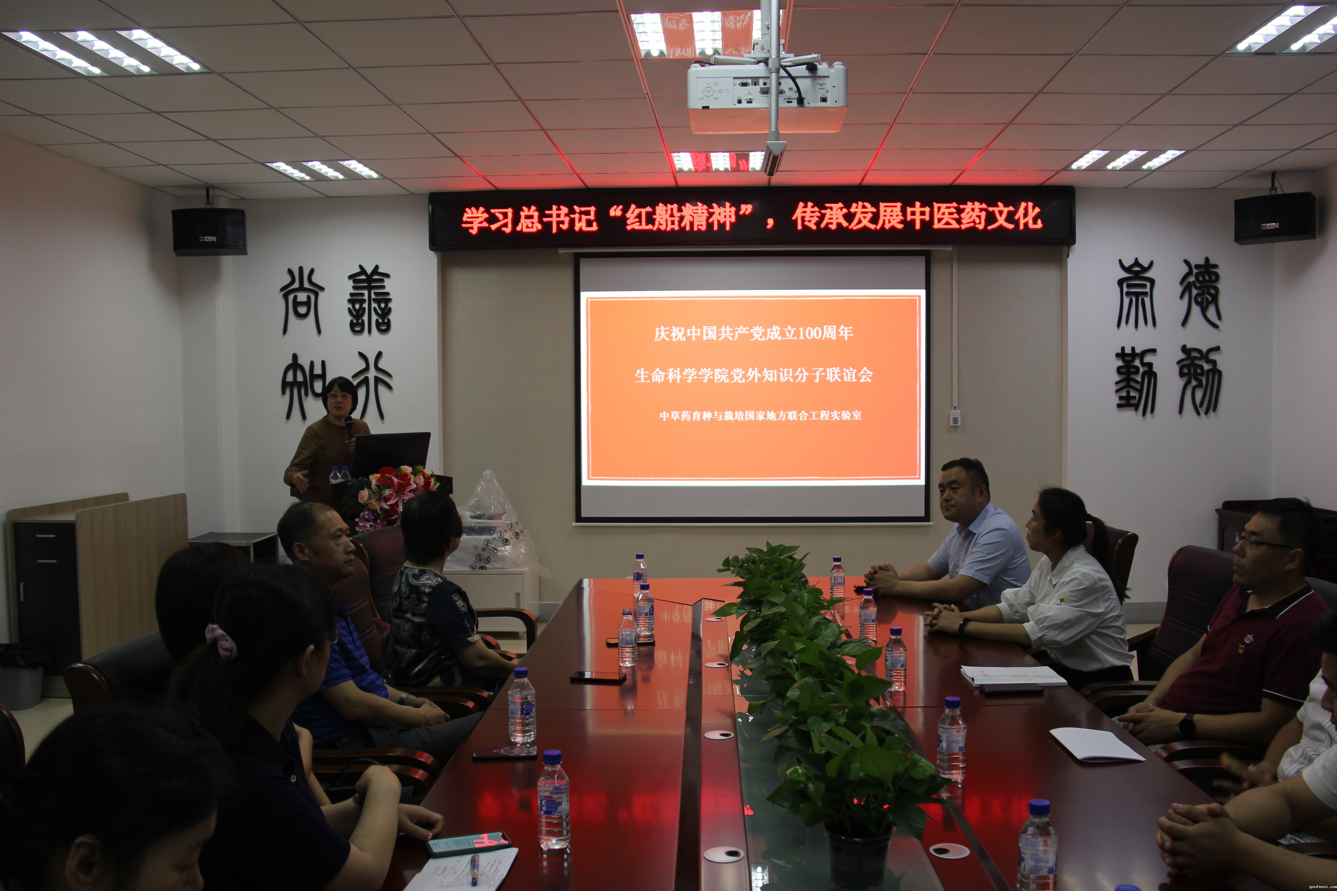 为庆祝中国共产党成立100周年,深入学习贯彻习近平总书记在党史雷竞技官网app动员大会上的重要讲话精神,大力弘扬革命传统精神,传承发展创新传统中医药文化,2021年6月28日13:30,生命科学学院党外知识分子联谊会与中草药育种与栽培国家地方联合工程实验室共同举办了“学习习近平总书记‘红船精神’,传承发展创新传统中医药文化”主题活动。生命科学学院党委书记白宇,党外知识分子联谊会教师代表,学院教学办、学工办工作人员以及中草药育种与栽培国家地方联合工程实验室全体师生参加了本次主题活动。活动由学院党外知识分子联谊会会长、中草药育种与栽培国家地方联合工程实验室主任陈霞主持。