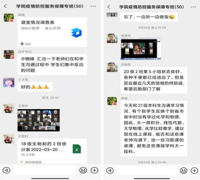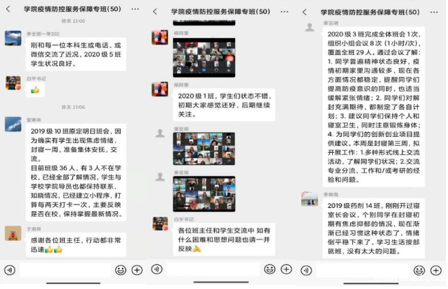 为加强全面疏导和精准指导,全体班主任与学工队伍不断创新工作方法,积极回应学生关切、解决学生诉求,通过专业化的心理辅导、亲情化的思想关怀、常态化的教育引领,引导学生平和心态、阳光战“疫”。结合重要时间节点,通过组织主题班会、小组会议,谈心谈话等形式,就学生关心的考研、保研、就业、毕业设计等问题进行逐一回应,为学生答疑解惑、排忧解难;通过自制接龙小程序、组建学习小组、开展线上打卡、撰写抗疫日记等方式,引导学生缓解紧张情绪、合理规划时间,加强体育运动和自我管理。