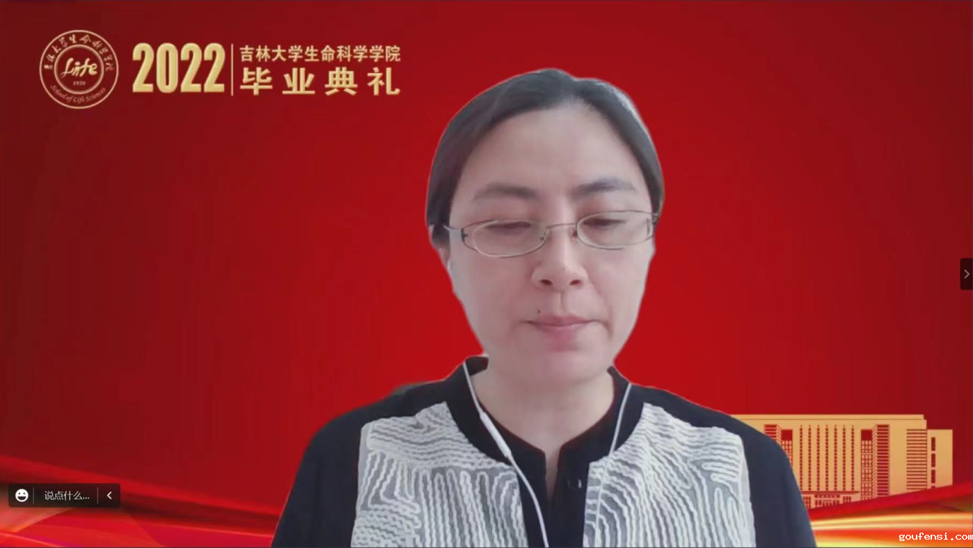 随后,2022届毕业本科生代表冷思宇同学发言,感情真挚诚恳饱含对学院的感激和眷恋。她首先分享了在校期间的学习生活体会和成长成才的经历,并表示是学院老师们的坚守、付出和陪伴坚定了她投身生命科学研究的梦想。同时表明,作为新时代的青年,生逢盛世、肩负重任,定会不忘初心、砥砺前行,跑出当代生科学子的最好成绩。最后,向学院、老师和全体毕业生献上真挚的祝福。