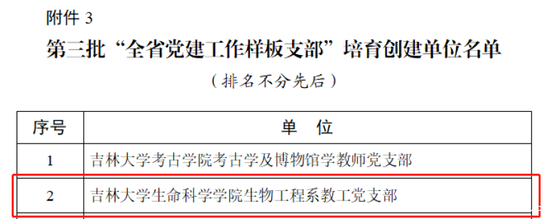 近日,中共吉林省委教育工作委员会正式公布第三批新时代全省党建工作示范高校、标杆院系、样板支部培育创建单位名单。✅雷竞技raybet在线-英雄联盟生物工程系教工党支部入选第三批“全省党建工作样板支部”培育创建单位。