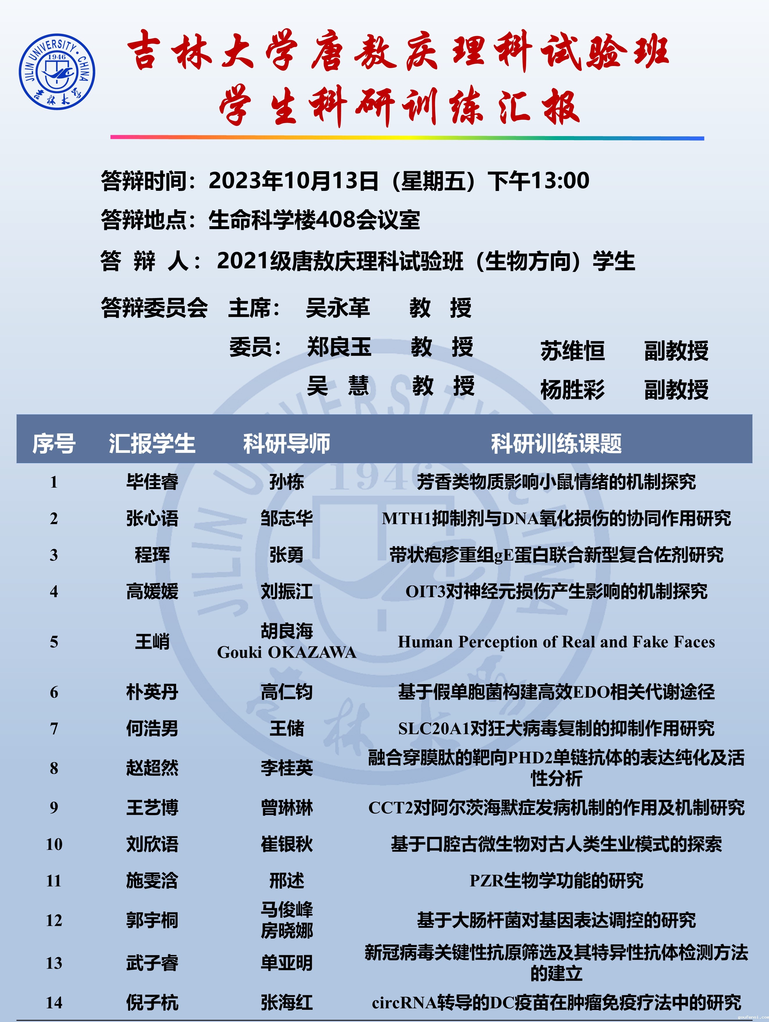 为提升唐敖庆理科试验班学生的科研素养,增强学生及科研导师之间的深入交流,生命科学学院于10月13日下午组织开展了唐敖庆理科试验班生物方向(唐生班)拔尖学生科研训练进展汇报。此次汇报面向全校公开进行,汇报主体为2021级唐生班全体学生和2020级唐生班学生代表,邀请吴永革教授、郑良玉教授、吴慧教授、苏维恒副教授、杨胜彩副教授担任专家评委。生命科学学院院长于湘晖教授、2021级唐生班科研导师、2022级唐生班学生以及学院唐生班学业导师团队出席汇报会,汇报会由副院长陈妍教授主持。