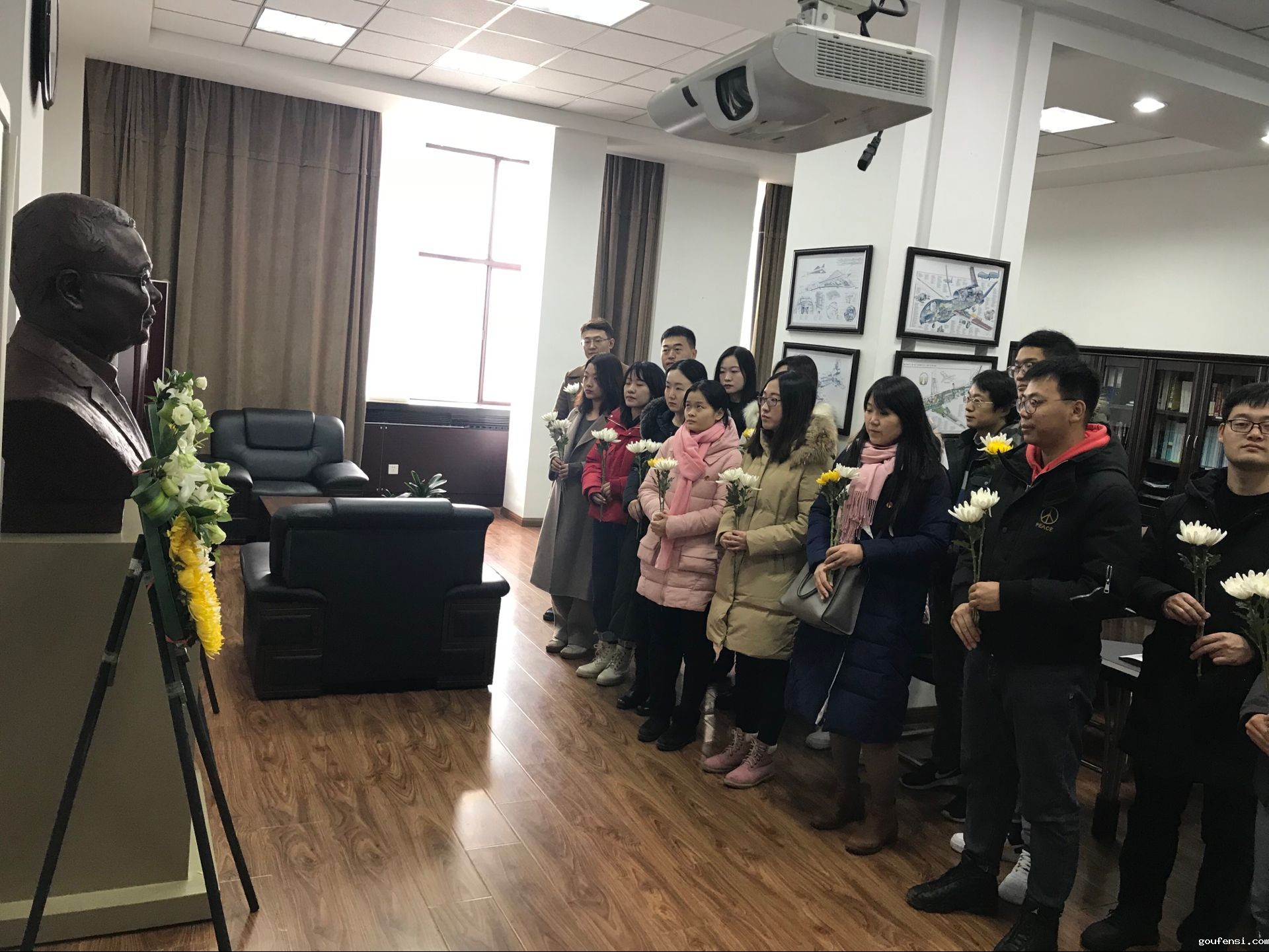黄大年纪念馆位于吉林大学朝阳校区,保留了黄大年老师的办公室的原貌,展示了他生前获得的荣誉证书、参加国家会议的证件、部分药品和生活用品、以及珍贵的科研手稿文件,这些都是黄大年教授为科研事业奉献一切、为祖国不懈奋斗的最好证明。党员们怀着敬慕之情,仔细地参观了大厅内摆放的展览品,详细了解了黄老师的研究内容与科研成果。展厅参观结束后,每一个党员都站在黄大年教授的雕塑前,列队向黄大年教授致敬并献花,表达对他的沉痛的悼念。