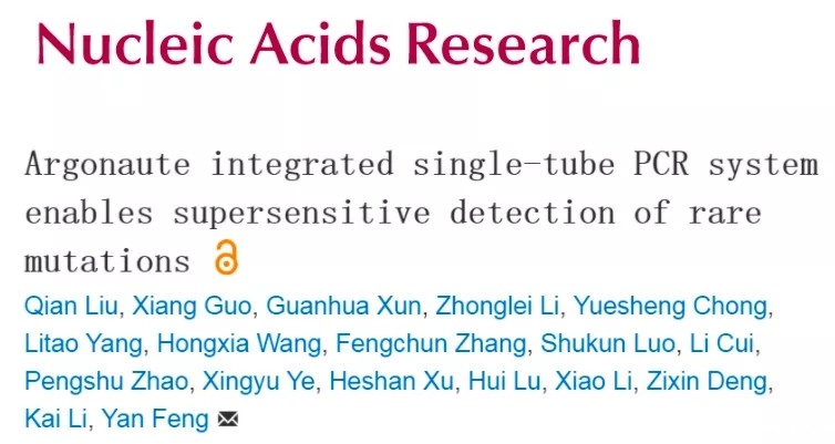 2021年4月27日,在线发表了上海交通大学生命科学技术学院冯雁教授团队在Nucleic Acids Research发表了文章Argonaute integrated single-tube PCR system enables supersensitive detection of rare mutations。研究人员提出了一种新型“A-Star” 低丰度SNV核酸富集技术,通过发现Argonaute核酸酶对单碱基突变(SNV)靶标序列精准识别的规律,发展了“一管式”PCR多重核酸富集和检测的A-Star (Ago-Directed Specific Target Enrichment and Detection) 新策略,实现血液等样本中低丰度突变基因的高效、多重富集和检测。