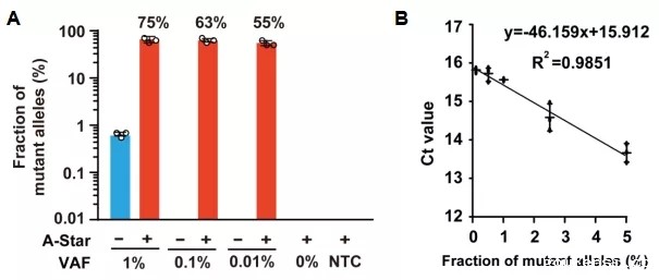 研究人员测试了A-Star对KRAS、PIK3CA和EGFR等多个肿瘤突变基因的富集效果,证实A-Star能够轻松检测和定量0.01%的稀有突变,富集效率高达5,500倍。
