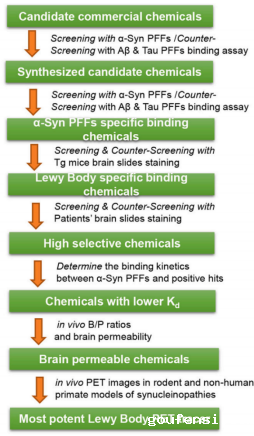 在进一步的验证实验中,研究团队鉴定了这种新型的苯并噻唑-乙烯基-苯酚衍生物 (F0502B),与α-Syn纤维的特异性结合高于Aβ和Tau纤维,并且能够选择性标记人体PD样本中的α-Syn聚集物。