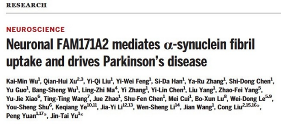 近期,生命科学学院校友刘聪(中科院上海有机化学研究所生物与化学交叉中心)团队与复旦大学附属华山医院郁金泰团队以及复旦大学脑科学转化研究院袁鹏教授团队合作在Science杂志发表题为 “Neuronal FAM171A2 mediates α-synuclein fibril uptake and drives Parkinson’s disease” 的最新研究成果。该研究鉴定出介导神经元摄取PD病理蛋白α-syn淀粉样纤维的神经元膜受体蛋白FAM171A2,并筛选获得具有阻断α-syn淀粉样纤维与受体结合的小分子化合物,本研究提供了全新的治疗PD的潜在靶点,为PD药物研发提供了新的可能。